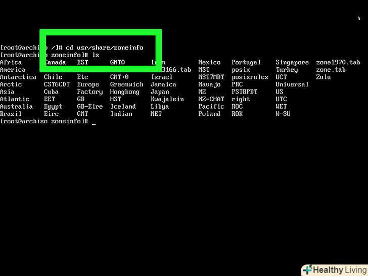 - Знайдіть потрібний часовий пояс, а потім введітьln-s/usr / share / zoneinfo/Країна/часовий пояс/etc/localtime і натисніть ↵ Enter.