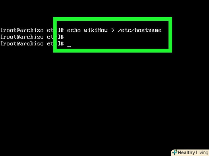 Вкажіть ім'я хоста для свого комп'ютера. Для цього введіть echo ім'я gt; /etc/hostname натисніть ↵ Enter.- Наприклад, щоб комп'ютер називався «Panda», введітьecho Panda gt; /etc/hostname.