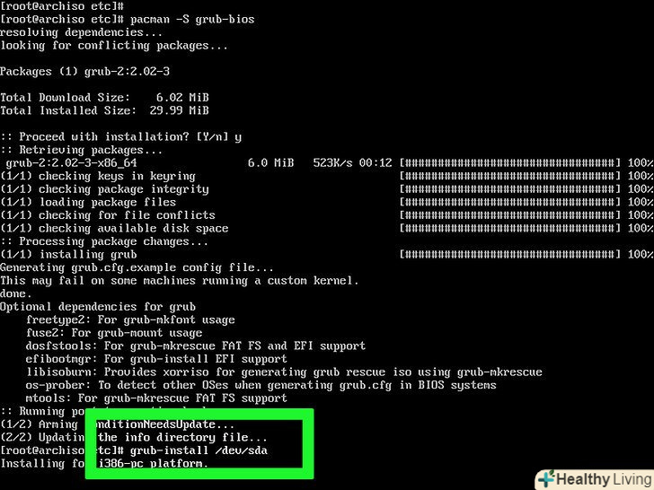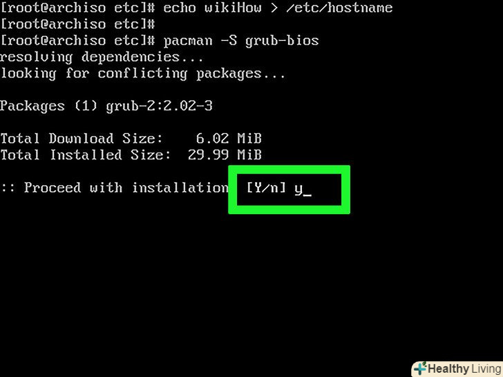 Скачайте завантажувач GRUB.це програма, яка встановить Arch Linux. Для цього:- Введітьpacman -S grub-bios натисніть ↵ Enter;