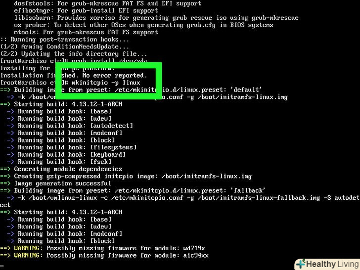 Створіть файл "init".у ньому зберігається інформація про обладнання комп'ютера, тобто за допомогою цього файлу система зможе працювати з комп'ютерними комплектуючими. Введіть mkinitcpio-p linux і натисніть ↵ Enter.
