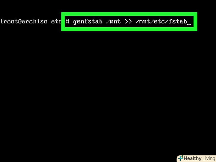 Створіть файл "fstab". Введіть genfstab/mnt gt;gt;/mnt/etc/fstab натисніть ↵ Enter. Так Arch Linux зможе ідентифікувати файлові системи розділу.