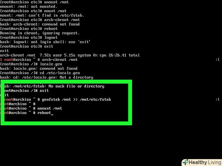 Перезавантажте комп'ютер. Введіть umount/mnt натисніть ↵ Enter, а потім введіть reboot і натисніть ↵ Enter. Вийміть DVD-диск і дочекайтеся, коли комп'ютер перезавантажиться.