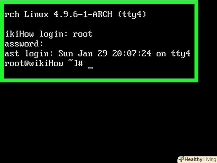 Увійдіть в свій аккаунт. введіть root в рядку «login» і натисніть ↵ Enter, а потім введіть пароль і натисніть ↵ Enter. Тепер ви успішно встановили і запустили Arch Linux на комп'ютері.- Щоб встановити графічний інтерфейс користувача, який дозволить користуватися мишею, встановіть GNOME на комп'ютері.