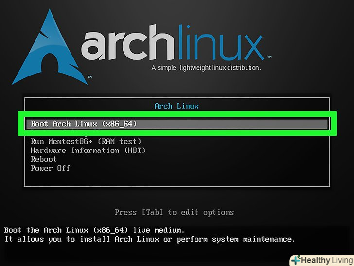 ВиберітьBoot Arch Linux (Запустити Arch Linux) і натисніть ↵ Enter.інсталятор Arch Linux буде запущений; тепер жорсткий диск можна розбити на розділи.