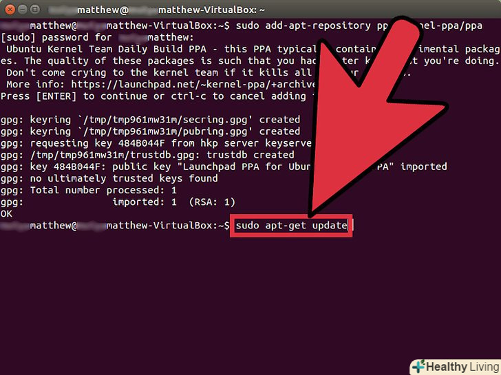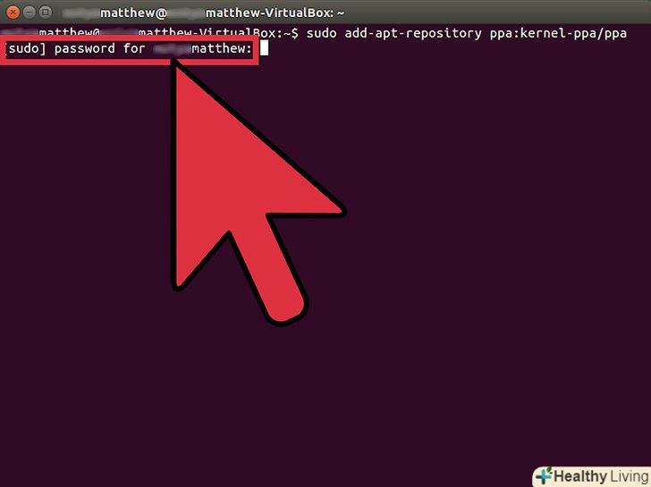 Щоб додати сховище Kernel, відкрийте "термінал" і введіть таку команду (або скопіюйте та вставте): sudo add-apt-repository ppa: kernel-ppa/ppa і натисніть Enter.