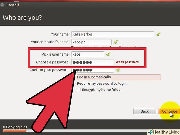 Створіть ім'я користувача та пароль.щоб встановити Linux, вам потрібно буде створити свій обліковий запис. Вам знадобиться пароль для входу в Linux, а також для виконання системних завдань.