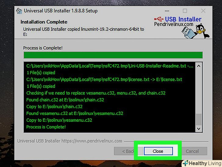 Закрийте програму UUI.натисніть кнопку «Сlose» (закрити), коли вона стане активною. Тепер Linux Mint можна встановити з флеш-накопичувача.