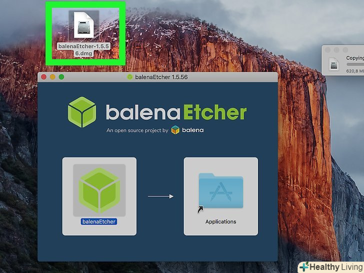 Встановіть програму Etcher. двічі клацніть по її DMG-файлу, дозвольте встановлювати програми невідомих розробників (Якщо з'явиться запит), а потім перетягніть значок Еtcher в папку «Програми».