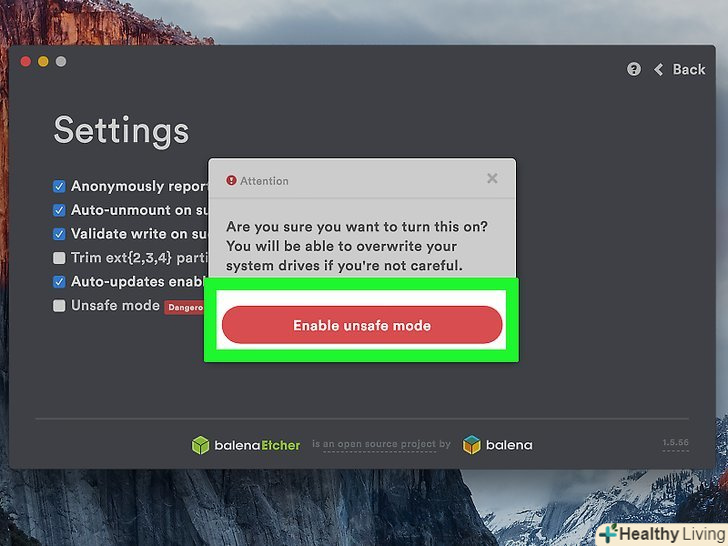 НатиснітьEnable unsafe mode (включити небезпечний режим), коли з'явиться запит.у цьому режимі ISO-файл можна записати на будь-який диск.