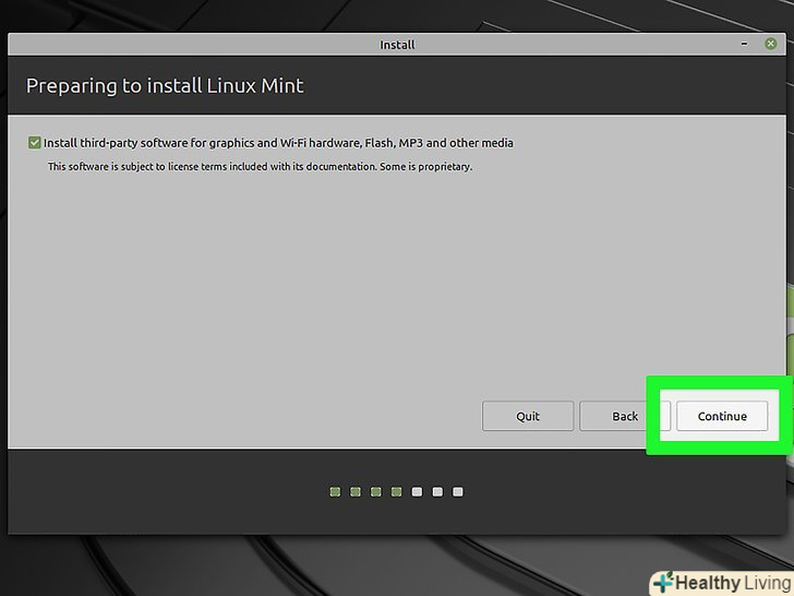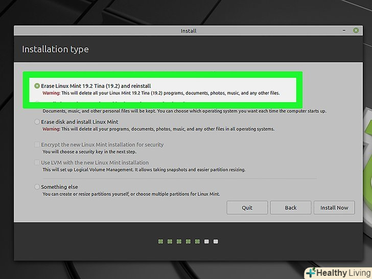 Вкажіть, що ви хочете замінити поточну операційну систему на Linux. встановіть прапорець біля "стерти диск і встановити Linux Mint", натисніть «Продовжити» gt; «Встановити зараз», а потім ще раз натисніть «Продовжити», коли з'явиться запит.