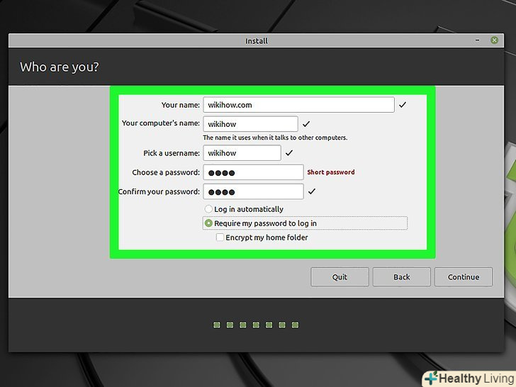 Введіть особисті дані.введіть своє ім'я, ім'я комп'ютера, ім'я користувача та пароль, а потім натисніть "Продовжити". Запуститься процес установки Linux на комп'ютер.
