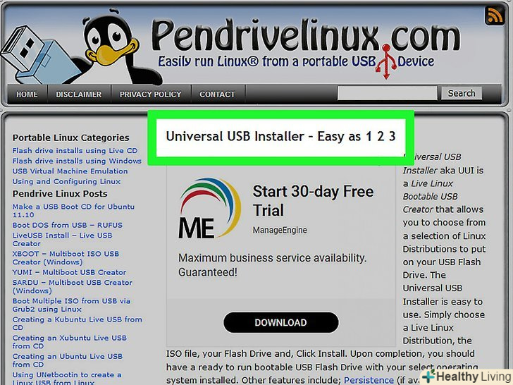 Завантажте програму для запису образів (ISO-файлів) на флеш-накопичувач. вона залежить від вашої операційної системи: [1]- Windows - перейдіть на сторінку https://www.pendrivelinux.com/universal-usb-installer-easy-as-1-2-3/, прокрутіть вниз і натисніть " Download UUI "(завантажити UUI);