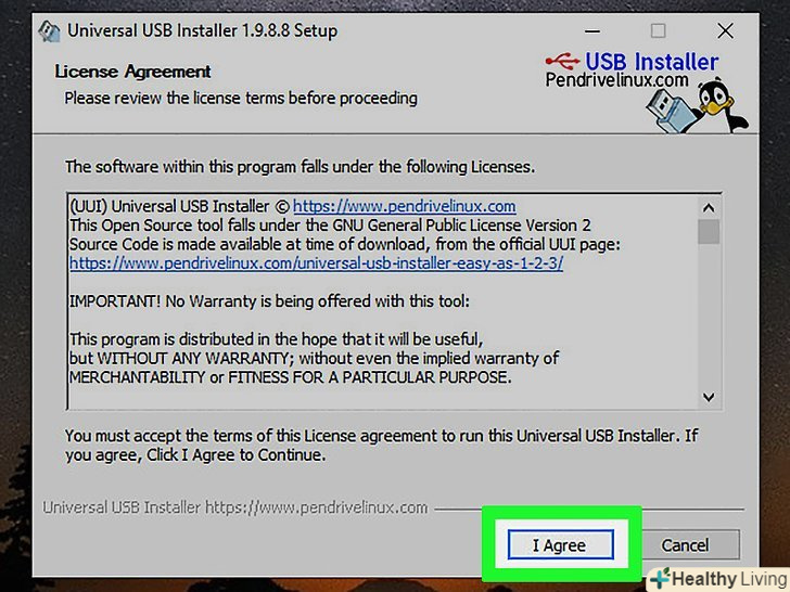 Встановіть програму для запису образів (ISO-файлів) на флеш-накопичувач.двічі клацніть по значку програми " Universal USB Installer "(у вигляді флеш-накопичувача), Натисніть «Yes» (так), коли з'явиться запит, а потім натисніть «I Agree» (приймаю). Відкриється головне вікно програми.