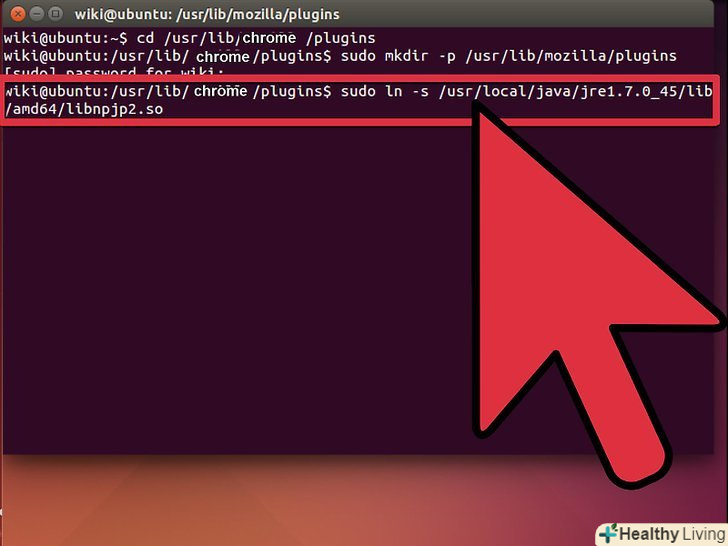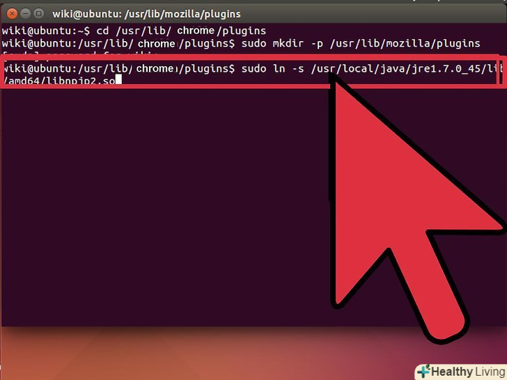 - Надрукуйте / скопіюйте / вставте: sudo ln-s / usr / local / java / jre1.7.0_40/lib/Amd64 / Libnpjp2.so