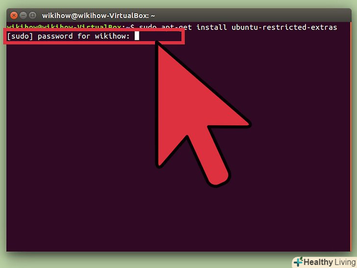 Введіть в термінал код "sudo apt-get install ubuntu-restricted-extras" і натисніть Enter.Примітка: лапки вводити не треба, лише слова. Коли закінчите, натисніть Enter.