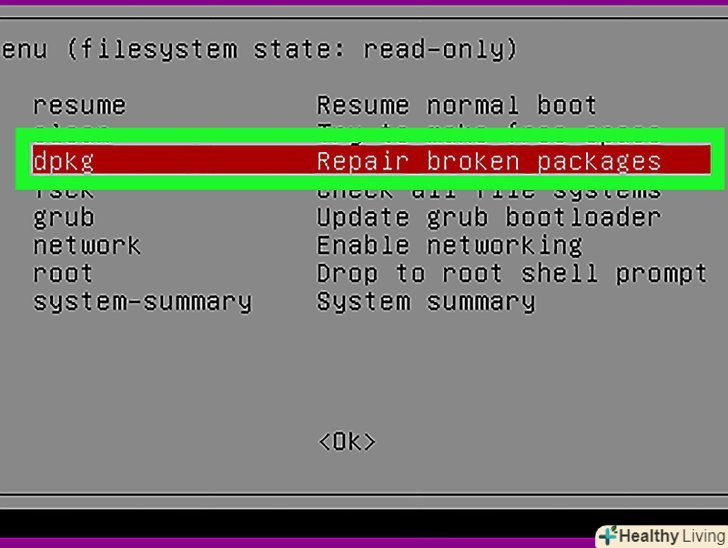 ВиберітьDpkg Repair broken packages (dpkg відновлення пошкоджених пакетів).це третя опція в меню відновлення. Буде зроблена спроба виправити пошкоджені пакети Ubuntu. Також жорсткий диск буде просканований на наявність помилок. У звіті пошукайте відомості про збійні секторах жорсткого диска-якщо вони є, можливо, проблема полягає в жорсткому диску; якщо ні, перевстановіть Ubuntu.[3]- Якщо проблема не усунена, можливо, вам доведеться перевстановити Ubuntu. Пам'ятайте, що це призведе до видалення всіх даних на диску. Прочитайте цю статтю, щоб дізнатися, як встановити Ubuntu.
