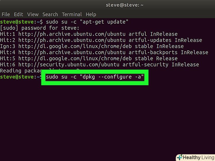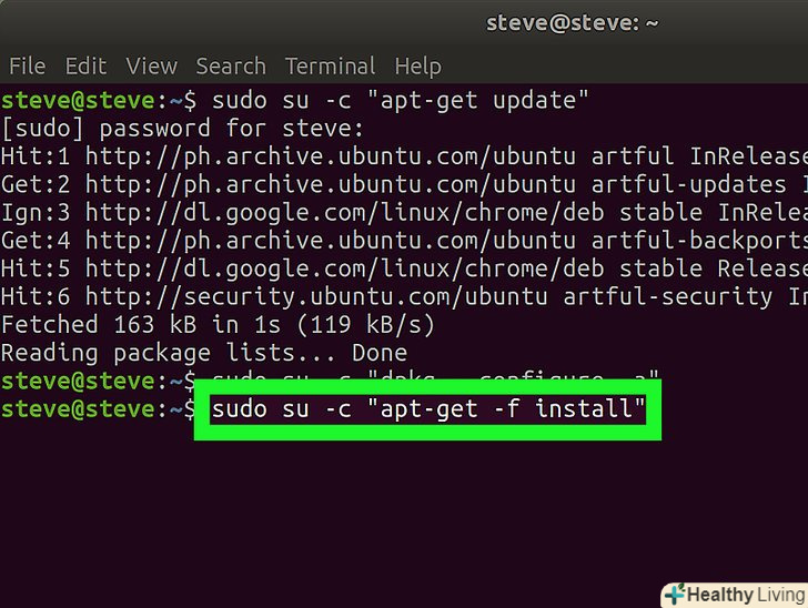 Введіть команду в терміналі. Команда: sudo su-c "apt-get-F install". Тепер натисніть Enter. Ця команда правильно налаштує залежності.[2]