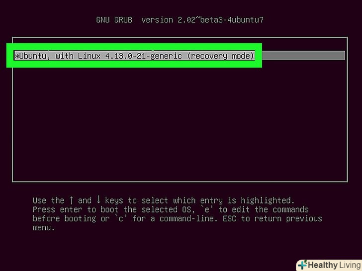 ВиберітьUbuntu, with Linux x.xx.x 32 generic (Recovery mode) (Ubuntu з Linux x. xx.x 32 (режим відновлення).Ubuntu запуститься в режимі відновлення.