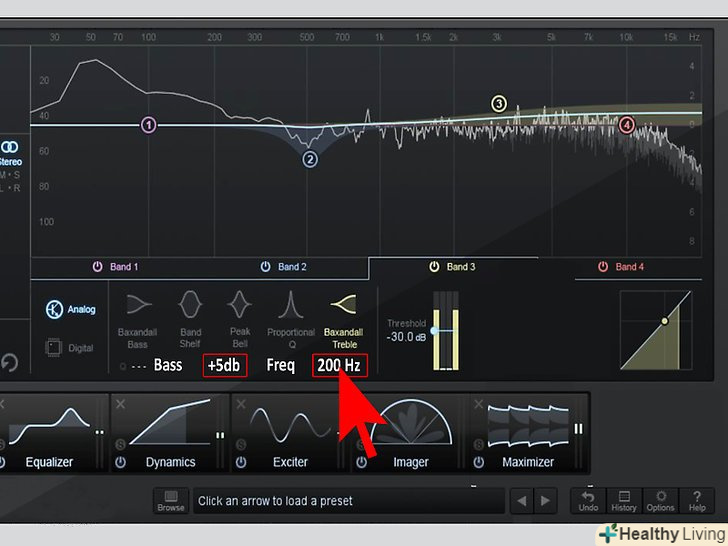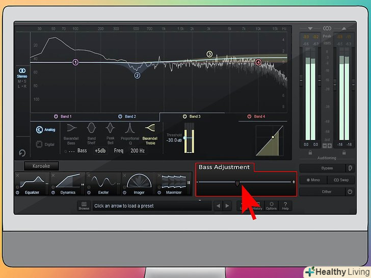 Налаштуйте аудіо еквалайзер, щоб зберегти баси.для того щоб не втратити баси, важливо внести кілька поправок. Встановити ослаблення сигналу на +5 дБ на частоті 200 Гц і нижче як лівого, так і правого каналів. Це дозволить зберегти баси.