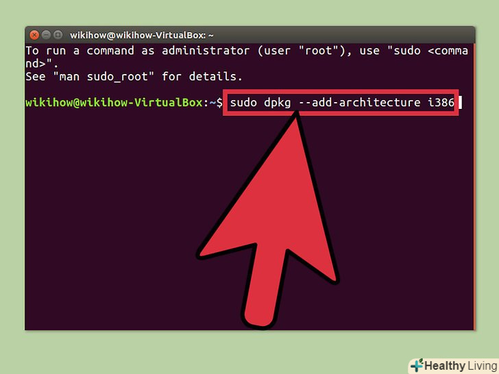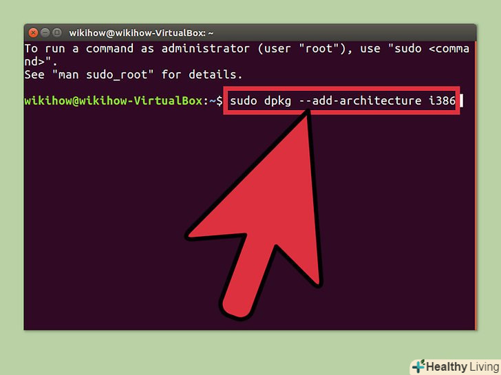Активуйте Multiarch (тільки для 64-розрядної Ubuntu).якщо ви працюєте з 64-розрядною версією Ubuntu, активуйте Multiarch, щоб отримати можливість встановити Skype. У терміналі:[6]- Введіть:sudo dpkg --add-architecture i386 натисніть ↵ Enter.