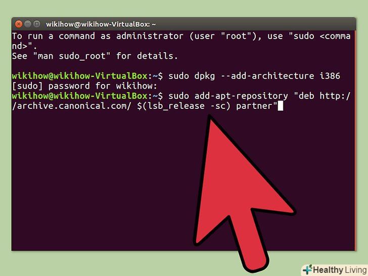 Підключіть партнерський репозиторій Canonical.за замовчуванням цей репозиторій відключений (в ньому зберігається Skype і безліч інших програм із закритим вихідним кодом).[2] щоб підключити репозиторій, в терміналі:[3]- Введіть:sudo add-apt-repository " deb http://archive.canonical.com / $(lsb_release-sc) partner "