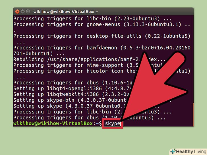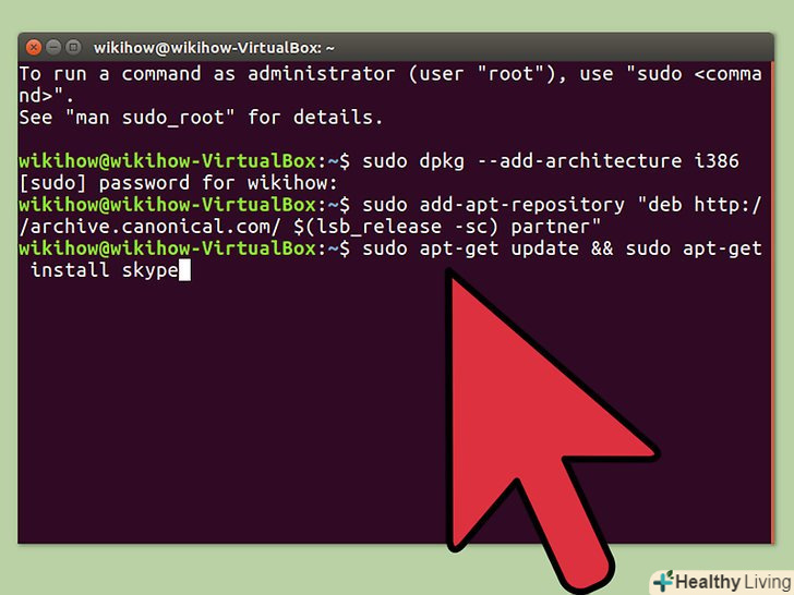 Активуйте Multiarch (тільки для 64-розрядної Ubuntu).якщо ви працюєте з 64-розрядною версією Ubuntu, активуйте Multiarch, щоб отримати можливість встановити Skype. У терміналі:[1]- Введіть:sudo dpkg --add-architecture i386