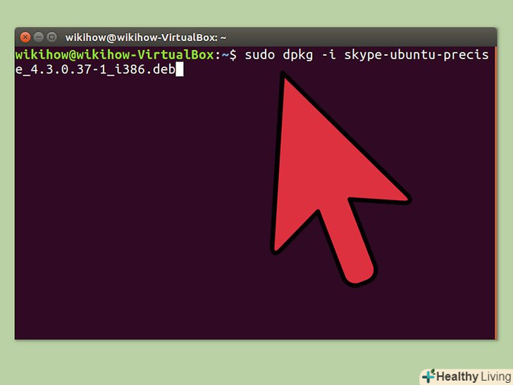 Встановіть Skype за допомогою скачаного пакета. Це робиться командою dkpg. Переконайтеся, що номер версії співпаде зі завантаженою версією.[7]- У терміналі введіть:sudo dpkg-i skype-ubuntu-precise_4.3.0.37-1_i386.deb і натисніть ↵ Enter.