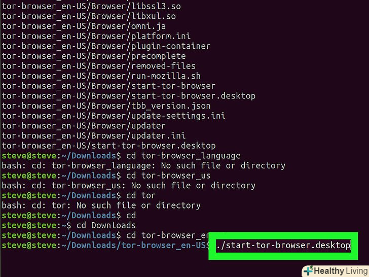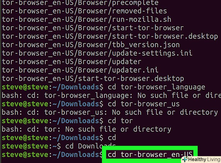 Відкрийте каталог браузера Tor. Введіть cd tor-browser_мова замість мова підставте мова обраної версії Tor), а потім натисніть ↵ Enter.