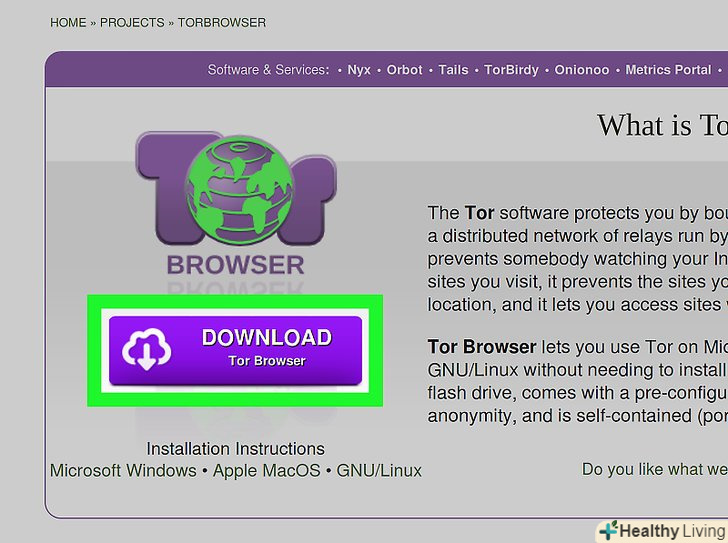 Відкрийте сайт Tor. перейдіть на сторінку https://www.torproject.org/projects/torbrowser.html у веб-браузері. Тут можна завантажити інсталяційний файл Tor.