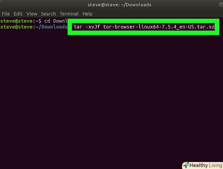 Витягніть вміст інсталяційного файлу Tor. введітьtar-xvJf tor-browser-linux64-7.5.6_мова .tar.xz (замість мова підставте мову обраної версії Tor), а потім натисніть ↵ Enter.[1]- Наприклад, щоб витягти вміст російськомовної версії інсталяційного файлу Tor, введітьtar-xvJf tor-browser-linux64-7.5.6_ru.tar.xz і натисніть ↵ Enter.