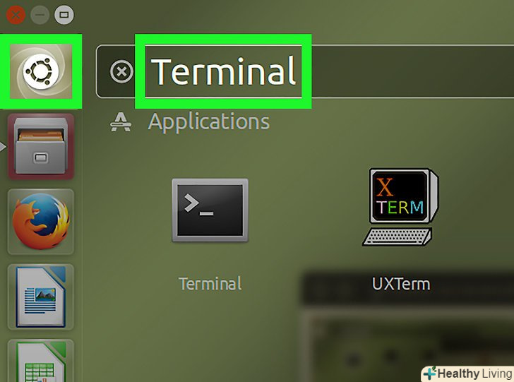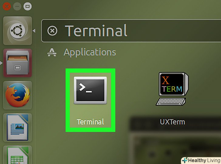 Клацніть по значку терміналу. цей значок виглядає як чорний прямокутник з білими символами " gt;_». Значок відобразиться на лівій панелі вікна "Меню «або в списку програм, який ви знайдете у вікні»Меню".- Також термінал можна знайти, якщо клацнути по рядку пошуку у верхній частині вікна "Меню", а потім ввеститермінал.
