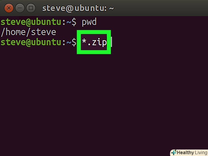 У терміналі введітьunzip "*.zip".на екрані відобразяться всі файли з розширенням .zip (тобто архіви), які присутні в поточному каталозі.- Лапки навколо*.zip повідомляють команді, що пошук потрібно вести тільки в поточному каталозі.