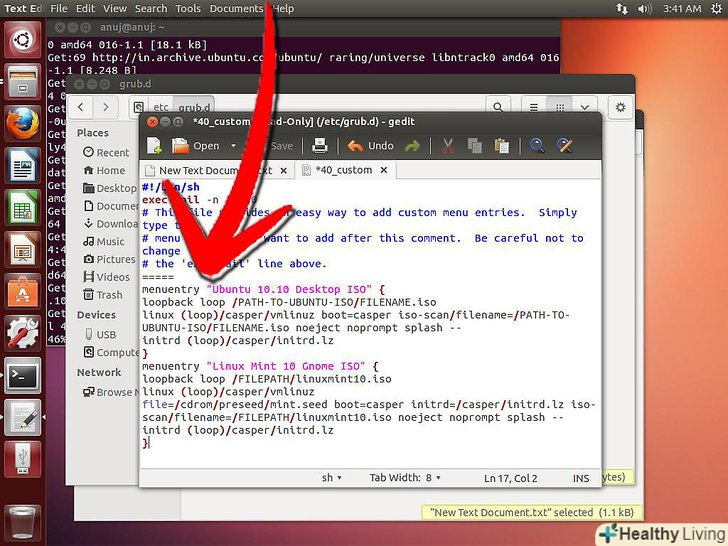 Додайте пункти меню, використовуючи наступний приклад. відкрийте файл 40_custom (ввівши команду sudo nano /etc/grub.d / 40_custom) і вставте наступні пункти меню в кінці файлу. Замініть / PATH-TO-UBUNTU-ISO / FILENAME.iso на відповідний шлях до ISO файлу. Приклад: /home/myUserName/Downloads/lubuntu-natty-i386.iso