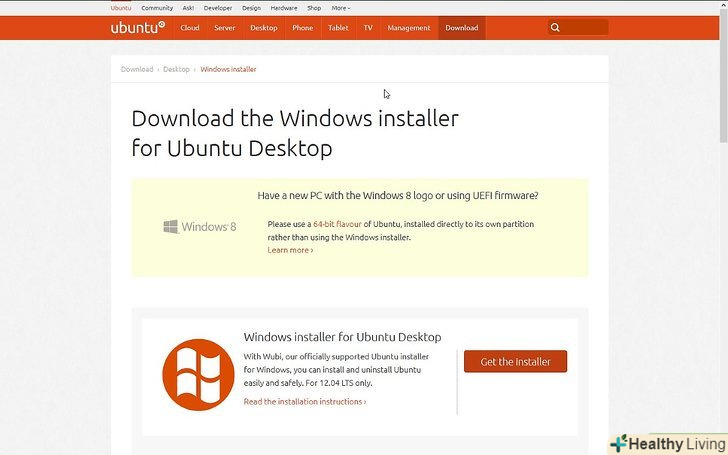 Скачайте майстер установки з сайту Ubuntu.якщо ваш браузер підтримує функцію, натисніть запустити зберегти або відкрити. Майстер установки Windows не сумісний з ОС Windows 8. Якщо у вас стоїть ця ОС, скористайтеся попереднім способом. brgt;- Інсталятор Windows встановить Ubuntu поверх Windows. Ваші файли при цьому не постраждають. Після перезавантаження комп'ютера ви зможете вибирати, яку операційну систему використовувати.