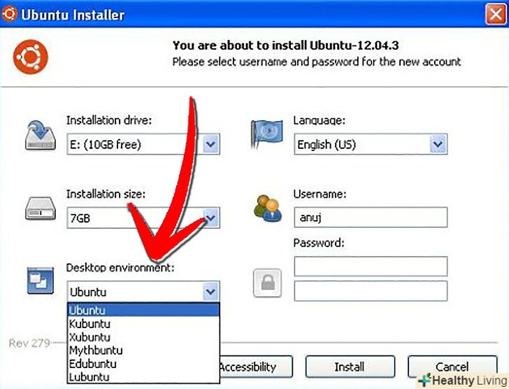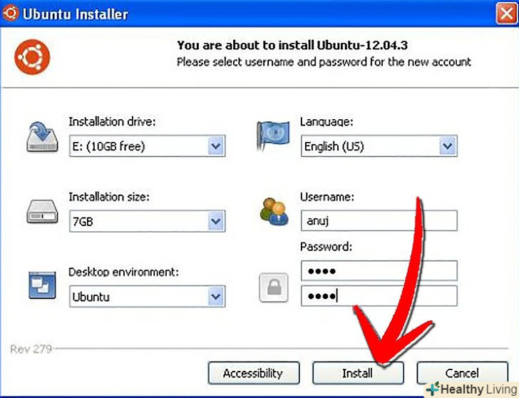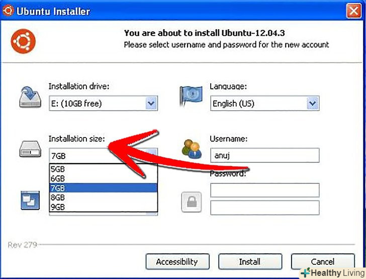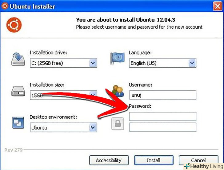 Виберіть ім'я користувача та пароль.після завантаження майстра установки вам покажуть меню конфігурації. Виберіть нове ім'я та пароль.- Ви також можете змінити розмір установки Ubuntu. Чим більше ви відведете місця під установку, тим більше залишиться для установки додаткових програм і файлів. Але при цьому вільне місце в пам'яті, до якої має доступ Windows, зменшиться. brgt;