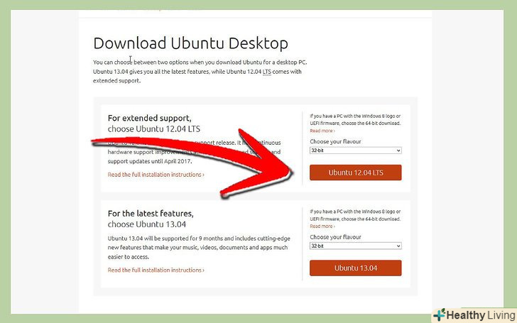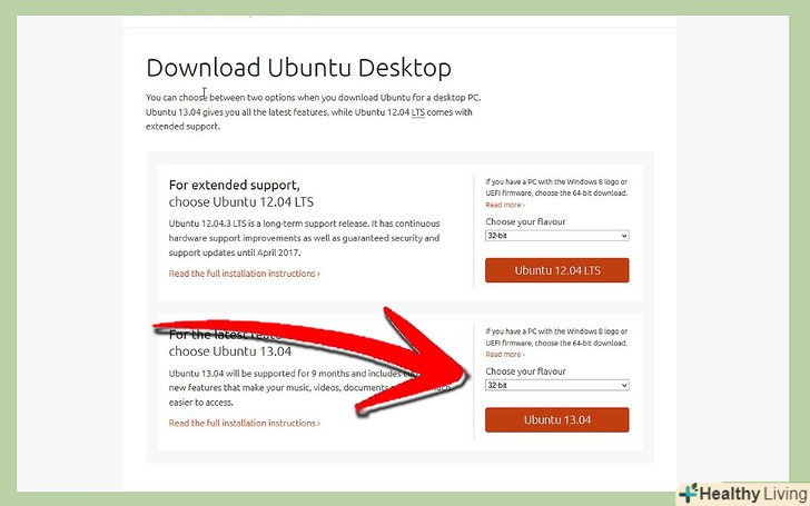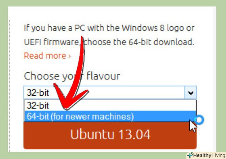 - Якщо у вас на комп'ютері стоїть ОС Windows 8 або ж прошивка UEFI, завантажуйте 64-розрядну версію Ubuntu. Для більш старих пристроїв підійде 32-розрядна версія.