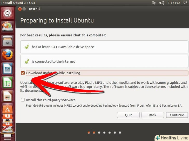 Встановіть Ubuntu.вам знадобиться не менше 4.5 GB вільного місця на диску, а то і більше, якщо ви хочете встановлювати додаткові програми і створювати файли. Якщо ви встановлюєте операційну систему на ноутбук, переконайтеся в тому, що він підключений до живлення, оскільки установка – досить енергоємний процес, а це означає, що батарея буде розряджатися швидше звичайного.- Поставте галочки навпроти «завантажувати оновлення автоматично»і "встановити програмне забезпечення сторонніх розробників". Це по дозволить вам відтворювати MP3 файли і дивитися Flash, наприклад, на YouTube.