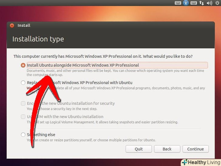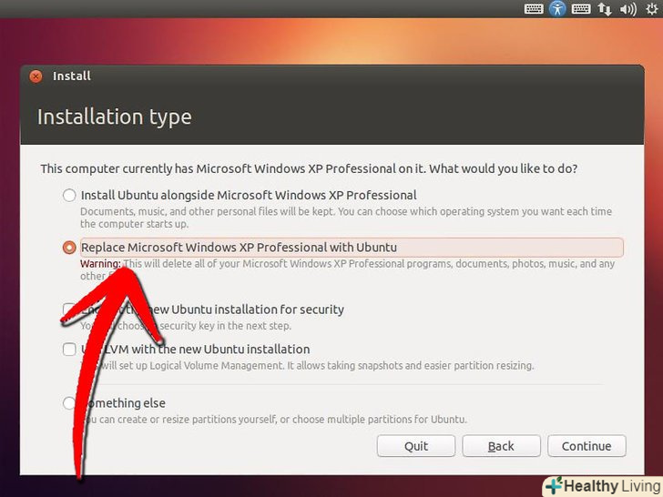 - Вирішіть для себе, що ви збираєтеся робити зі старою операційною системою.якщо у вас встановлений Windows, Вам буде запропоновано кілька варіантів установки Ubuntu. Ви можете встановити Ubuntu поверх Windows або ж замінити її.