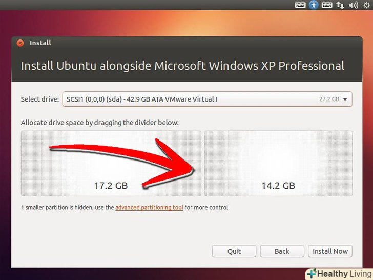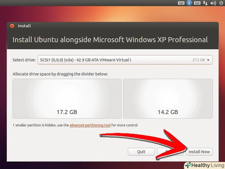 Виберіть розділ диска (логічний диск).якщо ви встановлюєте Ubuntu поверх Windows, ви можете використовувати повзунок прокрутки для того, щоб вибрати, скільки вільного місця на жорсткому диску буде відведено під Ubuntu. Пам'ятайте, що Ubuntu буде займати не менше 4.5 GB, а ще ж необхідно залишити місце для програм і файлів.- Як тільки налаштуєте все під себе, натискайте на кнопку « Встановити зараз».
