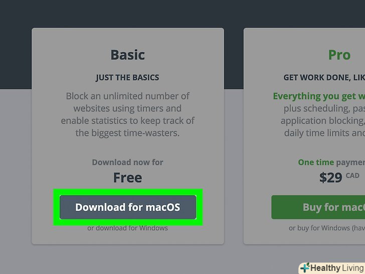 НатиснітьDownload for macOS (Завантажити для macOS).ця сіра кнопка розташована в розділі "Basic" (Початкова). Це безкоштовна версія програми Cold Turkey. Безкоштовна версія дозволяє блокувати сайти в Safari, Chrome і Firefox протягом певного проміжку часу.- Зелена кнопка веде до платної версії Програми. Вона коштує $25 (1625 рублів) і дозволяє встановлювати щоденні обмеження за часом, блокувати Додатки і багато іншого.