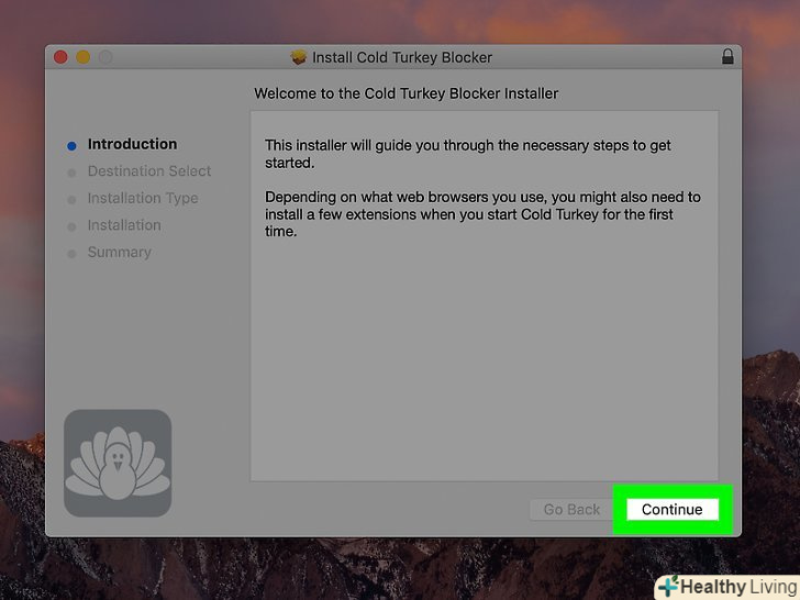 Дотримуйтесь інструкцій на екрані, щоб встановити Cold Turkey.- НатиснітьContinue (продовжити) в правому нижньому кутку вікна установника.