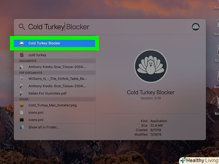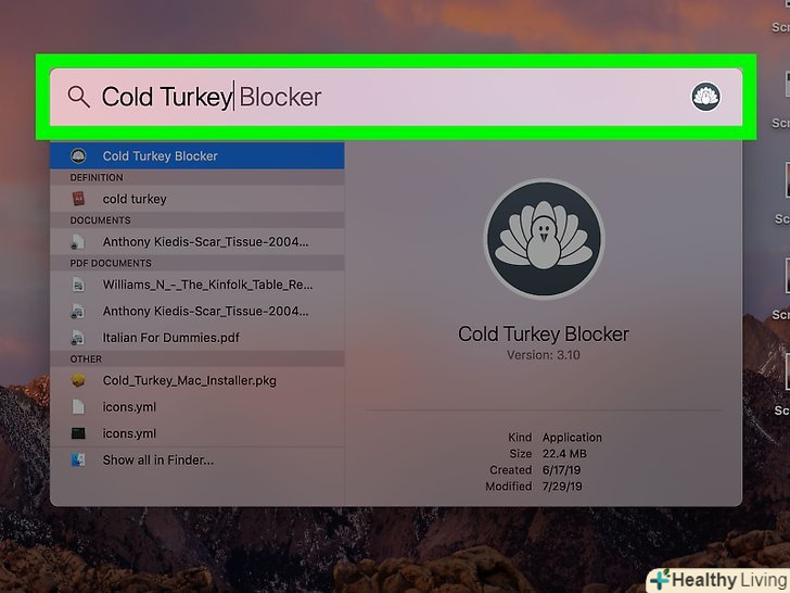 Відкрийте Spotlightі введіть «Cold Turkey». Spotlight знаходиться праворуч у рядку меню. Під рядком пошуку відобразяться результати пошуку.