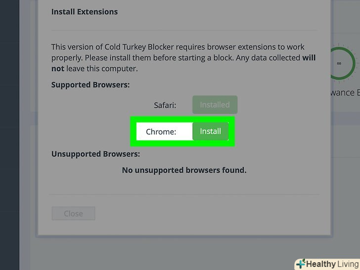 НатиснітьInstall (встановити) поруч з використовуваними веб-браузерами.відкриється сторінка установки розширення у веб-браузері. Розширення Cold Turkey доступно для Safari, Chrome і Firefox.- Розширення для Safari встановиться автоматично під час установки програми Cold Turkey.