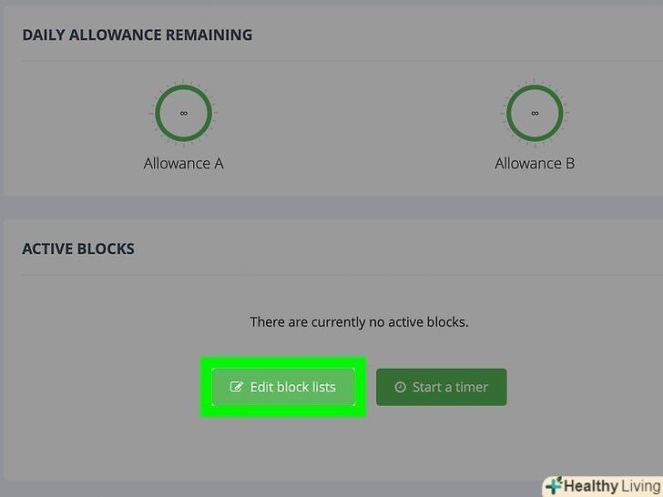 Клацніть поEdit block lists (редагувати списки заблокованих сайтів).це Зелена кнопка внизу сторінки.- Також можна вибрати опцію " Block Lists "(Списки заблокованих сайтів) в меню зліва.