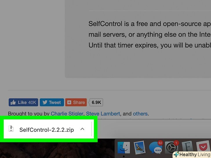 Розпакуйте завантажений архів SelfControl-2.2.2.zip.ви знайдете його в папці "завантаження" в Finder або внизу вікна Chrome або Safari, коли скачування завершиться. З архіву буде витягнутий файл SelfControl.app.- Натисніть на витягнутий файл SelfControl.app.запуститься процес установки програми SelfControl.