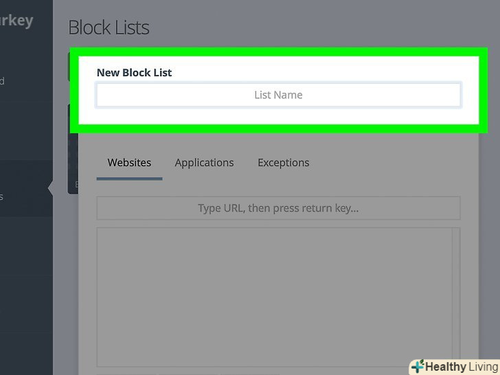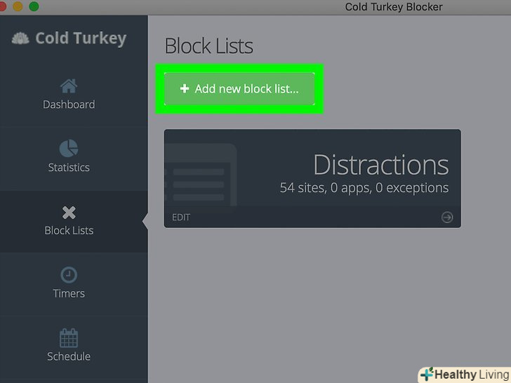 Натисніть+ Add a new block list (створити список).так ви створите новий список заблокованих сайтів.- У Cold Turkey є попередньо встановлений список " Distractions "(відволікаючі сайти), в якому перераховані 54 популярних сайту.