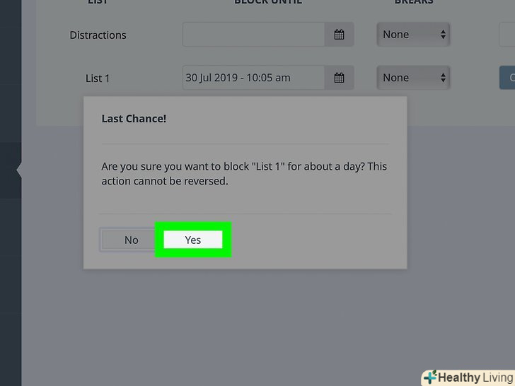Клацніть поYes (так). так ви підтвердите, що хочете встановити таймер і заблокувати додані в список веб-сайти на заданий проміжок часу.- Попередження: таймер зупинити не можна (потрібно дочекатися завершення його роботи).