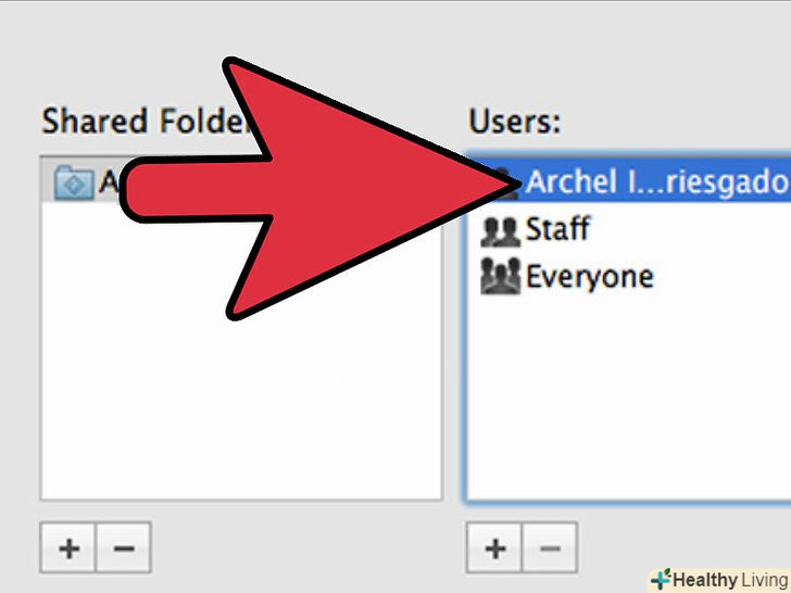 Зі списку користувачів виберіть ім'я вашого Mac.це дозволить вам отримати доступ до вибраних файлів і папок.- Щоб знайти ваше ім'я користувача, клікніть на плюсик під колонкою " Users "(користувачі) і Прокрутіть список, поки не знайдете потрібне.