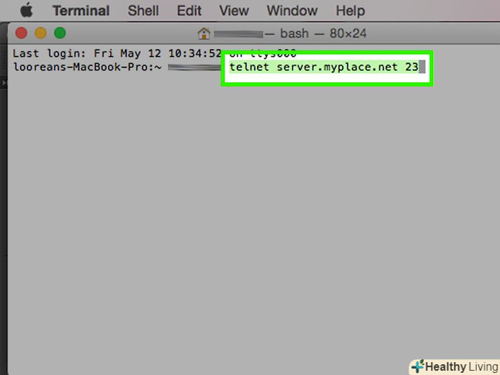 Введіть ім'я хоста та IP адресу. біля миготливого курсору введіть інформацію про логін, як показано тут:telnet server.myplace.net 23- Візьміть до уваги, що номер порту може відрізнятися. Зв'яжіться з адміністратором сервера, якщо підключення не відбулося.