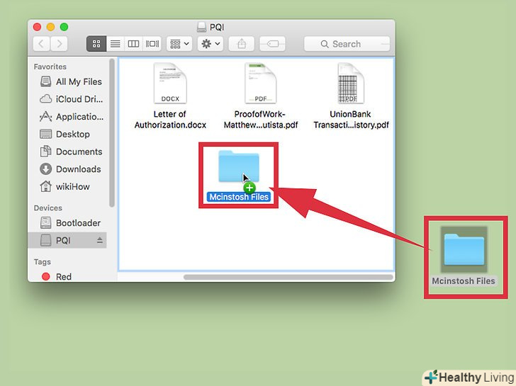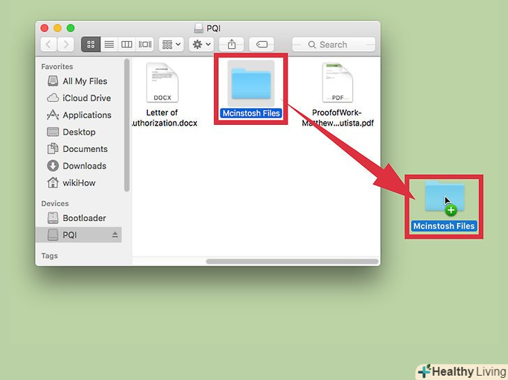 Скопіюйте файли з накопичувача.для цього просто перетягніть потрібні файли у відповідну папку на комп'ютері.- Також можна вибрати потрібні файли, а потім натиснути⌘ Cmd + C, щоб скопіювати їх, або ⌘ Cmd + X, щоб вирізати їх. Потім перейдіть в папку на комп'ютері і натисніть ⌘ CMD + V, щоб вставити файли.